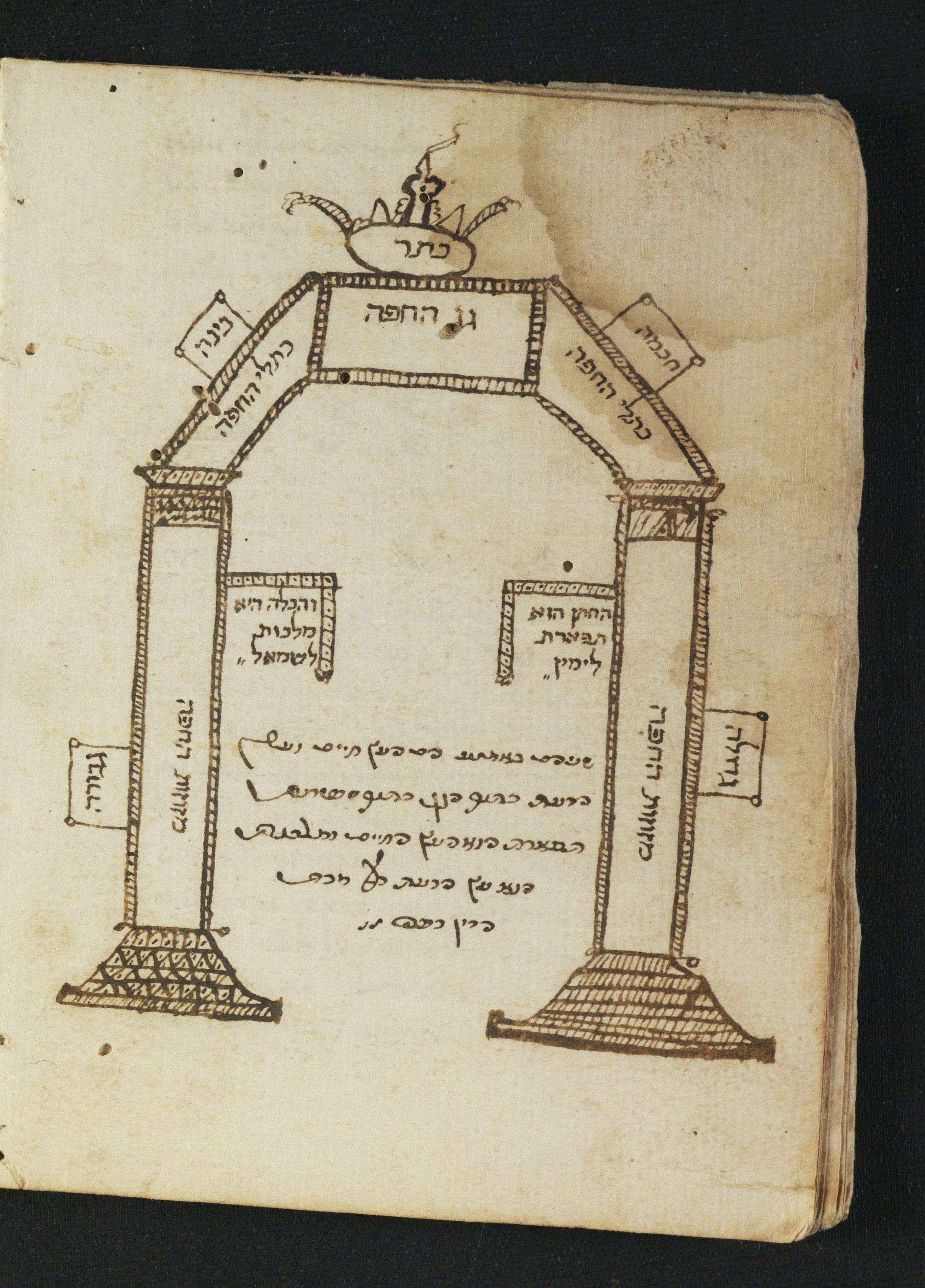 The drawing appears in an Italian manuscript drafted by R. Mordechai Pieto in the sixteenth century, and is in the collection of the Israel Museum (MS 2964).