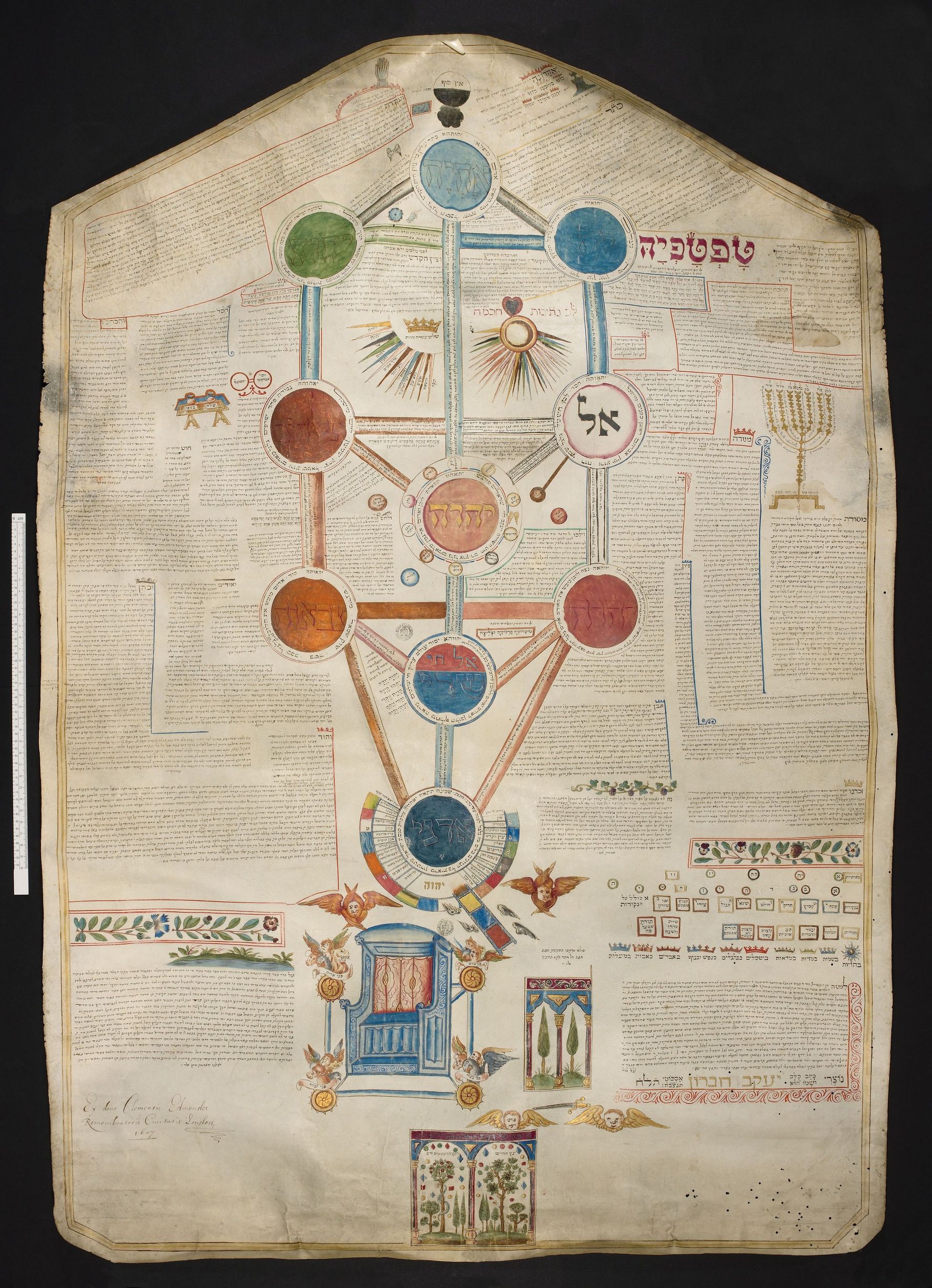 At the center of the parchment we see an Ilan surrounded by texts – the latter being an early fourteenth-century century commentary on the Sefirot by R. Reuven Zarfatti.